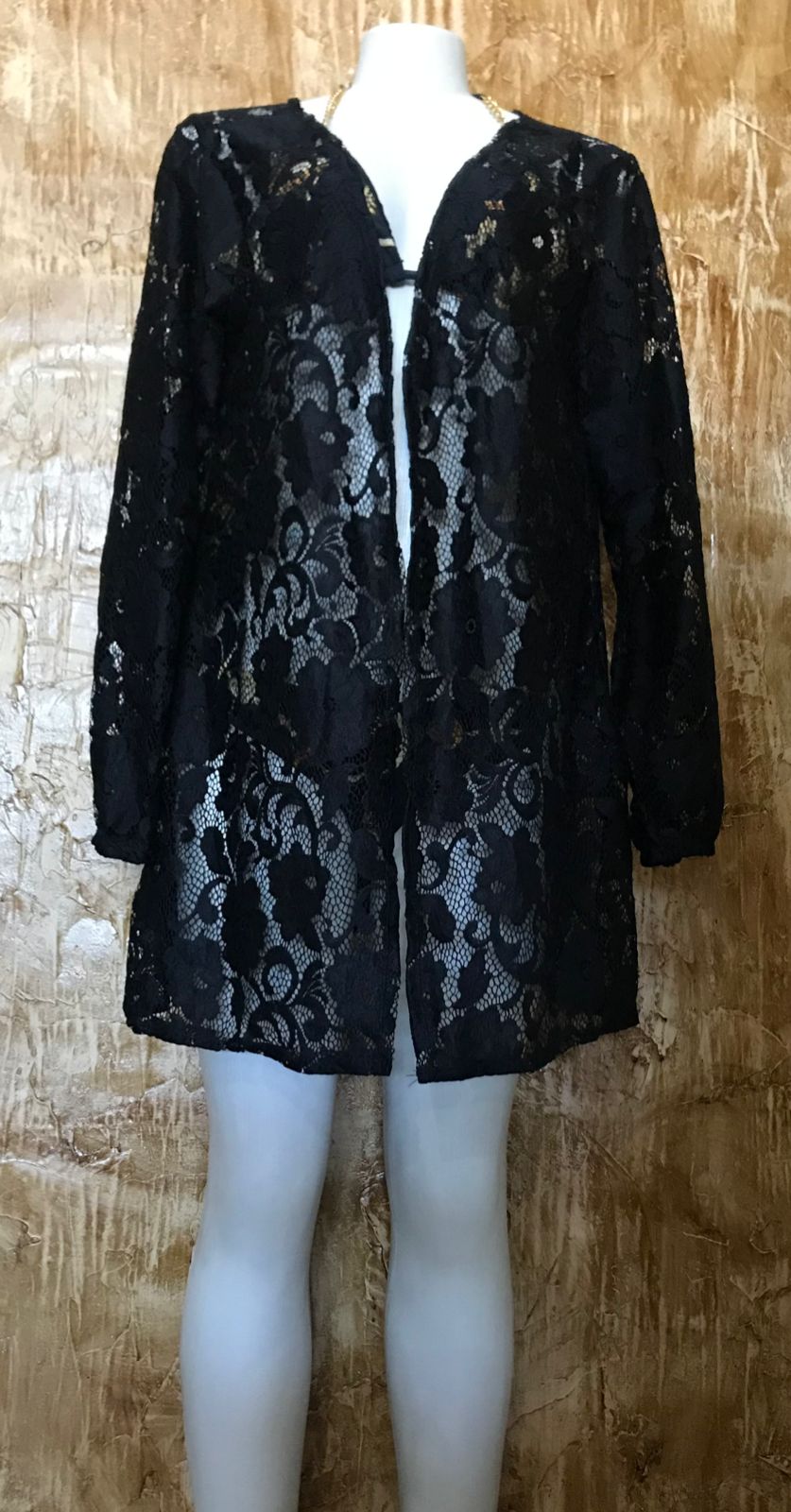 Saída de praia curta com mangas longas, tecido em renda, cor preta – tamanho único.